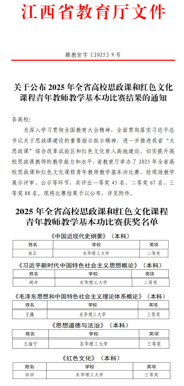 近日,由中共江西省委教育工委、江西省教育厅举办的2025年度全省高校思政课和红色文化课程青年教师教学基本功比赛结果公布,万搏官网入口_万搏中国荣获二等奖2项、三等奖3项。其中,张正和胡卉分别荣获《中国近现代史纲要》和《习近平新时代中国特色社会主义思想概论》本科组二等奖,王腾、王海宁和田田荣获《毛泽东思想和中国特色社会主义理论体系概论》《思想道德与法治》《红色文化》本科组三等奖。