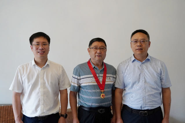 走访期间,张福庆来到老党员代表王来源家中,亲切询问其身体状况和生活需求,认真聆听他讲述参与学校建设发展的奋斗历程。张福庆为老党员佩戴“光荣在党50年”纪念章,对其数十年来恪守入党初心、躬耕教育事业的崇高品格给予高度评价。