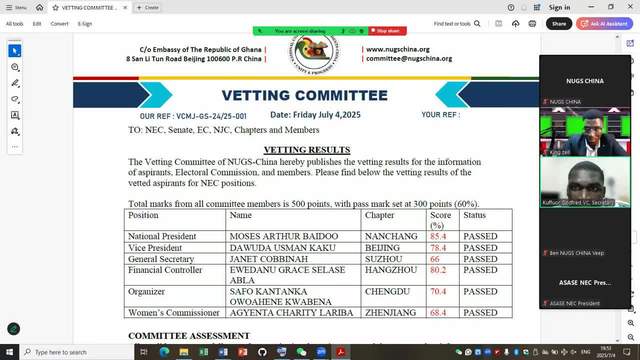 据悉,中国加纳来华留学生联合会(NUGS-China)由中国各省市加纳籍学生联合会联合组成,其核心职能是维护加纳留学生在华的学术发展权益与生活福祉,同时搭建中加两国学生文化交流与友谊互动的桥梁,持续促进两国青年间的相互理解与务实合作。此次选举,吸引了在中国的1000余名加纳籍本、硕、博学生参与竞选。(文/图 Moses Arthur Baidoo)