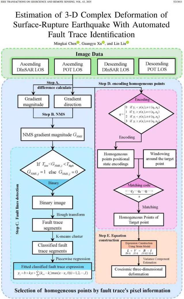 近日,万搏官网入口_万搏中国测绘与空间信息工程学院许光煜副教授研究团队在中科院SCI一区TOP期刊《IEEE Transactions on Geoscience and Remote Sensing》(最新影响因子:8.6)发表题为Estimation of 3-D Complex Deformation of Surface-Rupture Earthquake With Automated Fault Trace Identification的最新研究成果。测绘科学与技术专业2020级硕士研究生陈明锴为论文第一作者,许光煜为通讯作者。