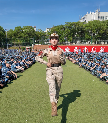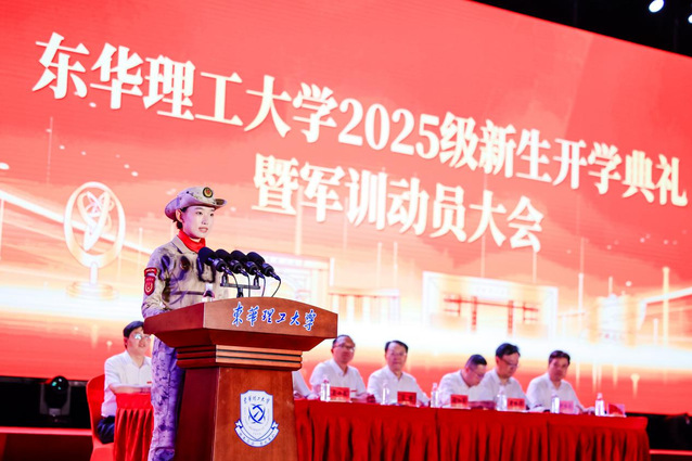 9月16日晚,郝茹婧作为优秀校友代表在新生开学典礼上发言,并在主席台前展示了阅兵式上的标准正步动作。步伐铿锵、意气风发,瞬间点燃全场气氛,用最直观的方式展现了东华理工人昂扬的精神姿态,也将扎根于心、外化于行的报国情怀深深烙印在新生心中。