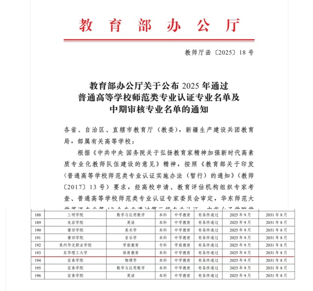 近日,教育部办公厅正式发布了《教育部办公厅关于公布2025年通过普通高等学校师范类专业认证专业名单及中期审核专业名单的通知》(教师厅函〔2025〕18号),万搏官网入口_万搏中国体育教育专业顺利通过师范类第二级专业认证,认证结论为“有条件”通过,有效期为六年,自2025年9月起至2031年8月止。(图/文 雷乐乐)