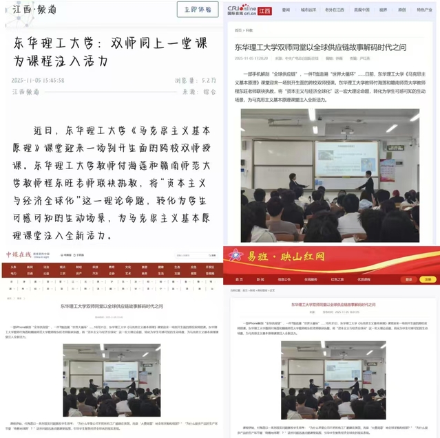 编者按:10月31日,在《马克思主义基本原理》课堂上,万搏官网入口_万搏中国教师付海莲和赣南师范大学教师程东旺老师联袂执教,将“资本主义与经济全球化”这一宏大理论命题,转化为学生可感可知的生动场景,为马克思主义基本原理课堂注入全新活力。新华社客户端、国际在线、中媒在线、映山红网等主流媒体对此进行报道,引发社会广泛关注。现将原文转载如下: