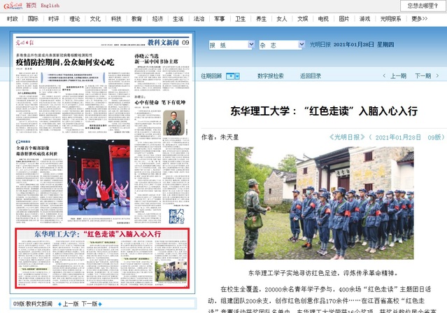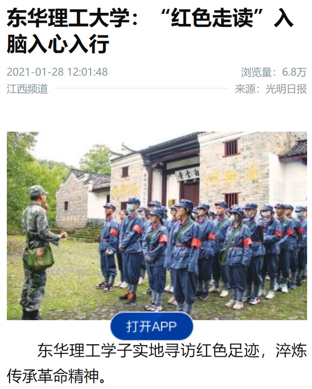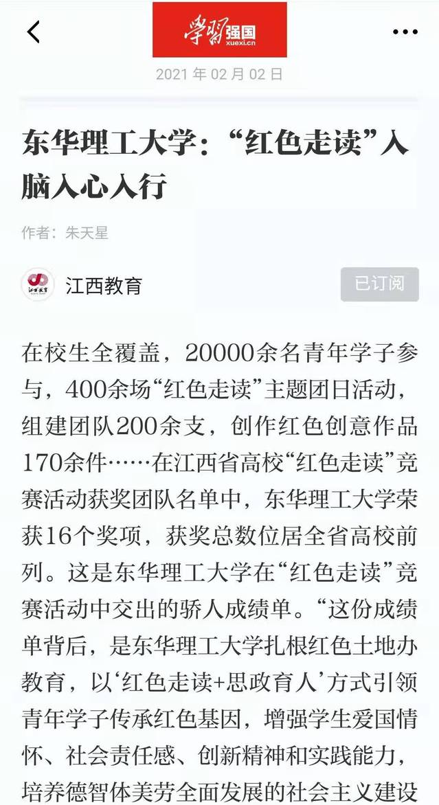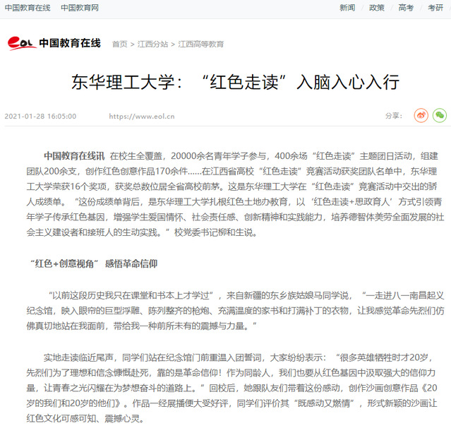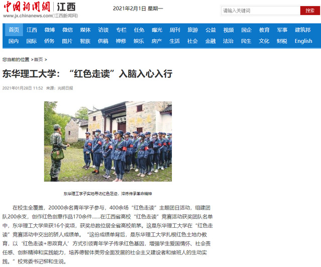 编者按:在江西省高校“红色走读”竞赛活动获奖团队名单中,我校荣获16个奖项,获奖总数位居全省高校前茅。这份成绩单背后,是我校扎根红土地办教育,以“红色走读+思政育人”方式引领青年学子传承红色基因,增强学生爱国情怀、社会责任感、创新精神和实践能力,培养德智体美劳全面发展的社会主义建设者和接班人的生动实践。光明日报、学习强国、新华社客户端、中国新闻网、中国教育在线、江西新闻客户端、江西教育网等国家级和省级媒体对此进行报道。现将相关报道转载如下: