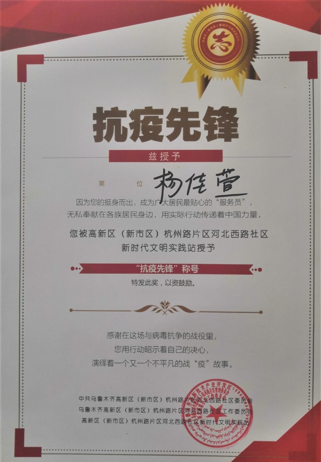 家在新疆乌鲁木齐杨佳萱,系我校理学院统计专业学生,由于社区封闭管理,为保证小区居民正常生活,杨佳萱主动到社区报到,成了广大居民贴心的“服务员”,无私奉献在各族居民身边,每天为居民购买日常用品、倒垃圾、取快递、量体温。她说:“这种关键时刻作为党员就做好带头作用,利用假期时间为社区做一些力所能及的事,内心有满满地成就感,我做得远远还不够杨佳萱用行动昭示着自己的决心,她被社区授予“抗疫先锋”荣誉称号。
