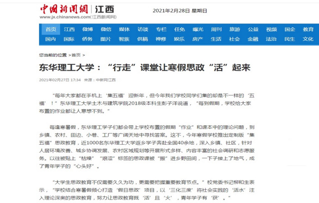 编者按:思政课堂不仅在校园里,更在广阔天地间。寒假期间,学校持续推进思政工作改革创新,倾心打造“集五福”假日思政项目,引导青年学生将自身成长融入家国发展大势。近1000名返乡学子深入乡镇、社区开展形式多样、内容丰富的社会调研和志愿服务,有力有效推进“三全育人”工作。中新网、新华社客户端、凤凰网、中国教育在线、江西新闻客户端、江西教育电视台、中国江西网等主流媒体对此进行报道,引发社会广泛关注,现将报道原文转载如下: