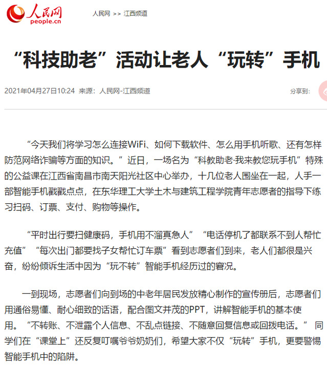 编者按:自党史学习教育开展以来,学校认真策划组织“我为群众办实事”实践活动,探索通过形式多样的党史学习教育实践,让党史学习教育在广大青年中内化于心、外化于行,努力做到“学史明理、学史增信、学史崇德、学史力行”。近日,我校学子围绕“科技助老”主题在社区开讲,手把手教老年人“玩转”手机,人民网、中国教育在线、凤凰网、江西新闻客户端、中国江西网等媒体对此进行报道,现将相关报道转载如下:
