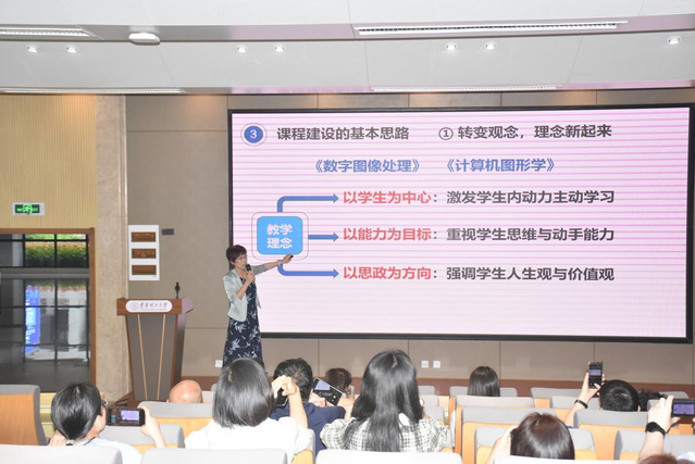 她展示了自己所授《数字图像处理》《计算机图形学》两门课程近二十年的建设历程,强调课程建设是一个系统的、长期的工作,需要积累沉淀,更需要教师们长期的研究实践。在教学过程中,始终要坚持“以学生发展为中心”理念,创新课程建设模式,不断优化课程内容,把最新研究成果转化为教学内容,做好课程教学设计,深入挖掘课程中的思政教育元素,打造具有高阶性、创新性、挑战度的“金课”,形成“老师善教、学生乐学”的高质量课堂教学新局面。
