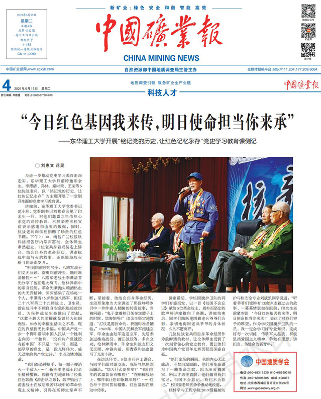 编者按:为进一步推动党史学习教育走深走实,我校日前特邀印余生、李潭清、孙林、席树荣、王荣等5位抗战老兵以“铭记党的历史,让红色记忆永存”为主题开展了一堂别开生面的党史学习教育课。中国矿业报、中新网、江西新闻客户端、江西文明网等对此进行报道,现将相关内容转载如下。