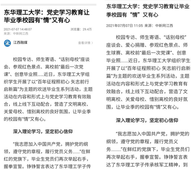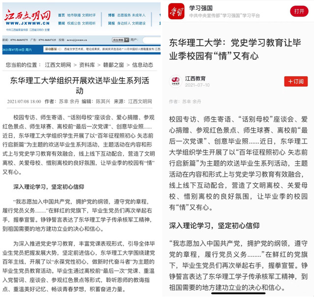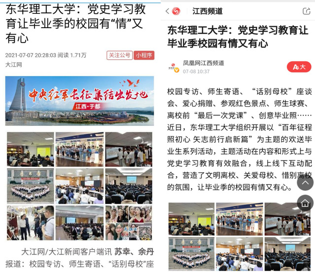 编者按:近日,我校组织开展了以“百年征程照初心 矢志前行启新篇”为主题的欢送毕业生系列活动,主题活动在内容和形式上与党史学习教育有效融合,营造了文明离校、关爱母校、惜别离校的良好氛围。新华社客户端、中新网、学习强国、大江网、凤凰网、江西文明网等媒体对此进行报道,现将相关内容转载如下: