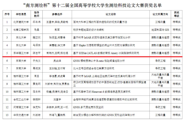 本次大赛包括“华测导航杯”第二届全国大学生测绘创新开发大赛、“南方测绘杯”第十二届全国高等学校大学生测绘科技论文大赛、“南方测绘杯”第六届全国高等学校大学生测绘技能大赛等三项赛事。我校测绘工程学院精心组织,选派的参赛队伍在“华测导航杯”第二届全国大学生测绘创新开发大赛中荣获特等奖2项、一等奖1项、二等奖1项;在“南方测绘杯”第十二届全国高等学校大学生测绘科技论文大赛中荣获特等奖1项、一等奖3项、二等奖3项;在“南方测绘杯”第六届全国高等学校大学生测绘技能大赛中荣获一等奖1项和二等奖3项。此外,我校荣获测绘技能大赛团体成绩一等奖。