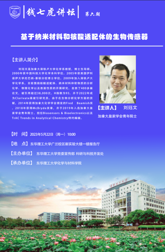 应化学与材料学院邀请,加拿大滑铁卢大学化学系教授,博士生导师刘珏文来到万搏官网入口_万搏中国,以“基于纳米材料和核酸适配体的生物传感器”为主题开展讲座。欢迎全校师生届时前往聆听。