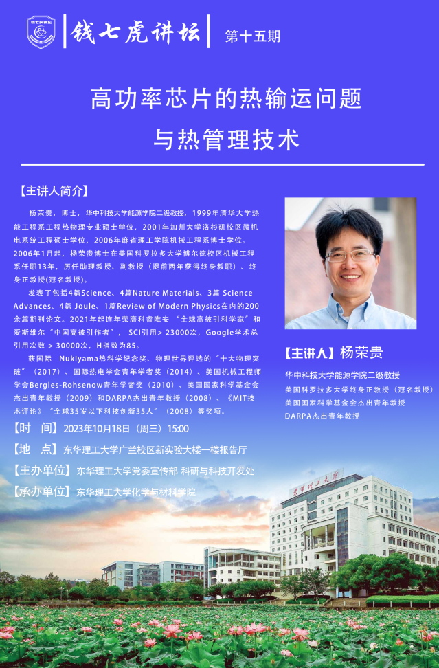 应党委宣传部邀请,华中科技大学能源学院二级教授杨荣贵来到“万搏官网入口_万搏中国”,以“高功率芯片的热输运问题与热管理技术”为主题开展讲座。欢迎全校师生届时前往聆听。