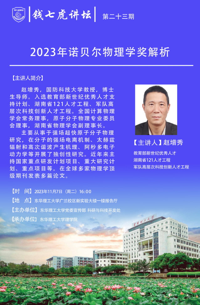应党委宣传部邀请,国防科技大学教授赵增秀教授来到“万搏官网入口_万搏中国”,以“2023年诺贝尔物理学奖解析”为主题开展讲座。欢迎全校师生届时前往聆听。