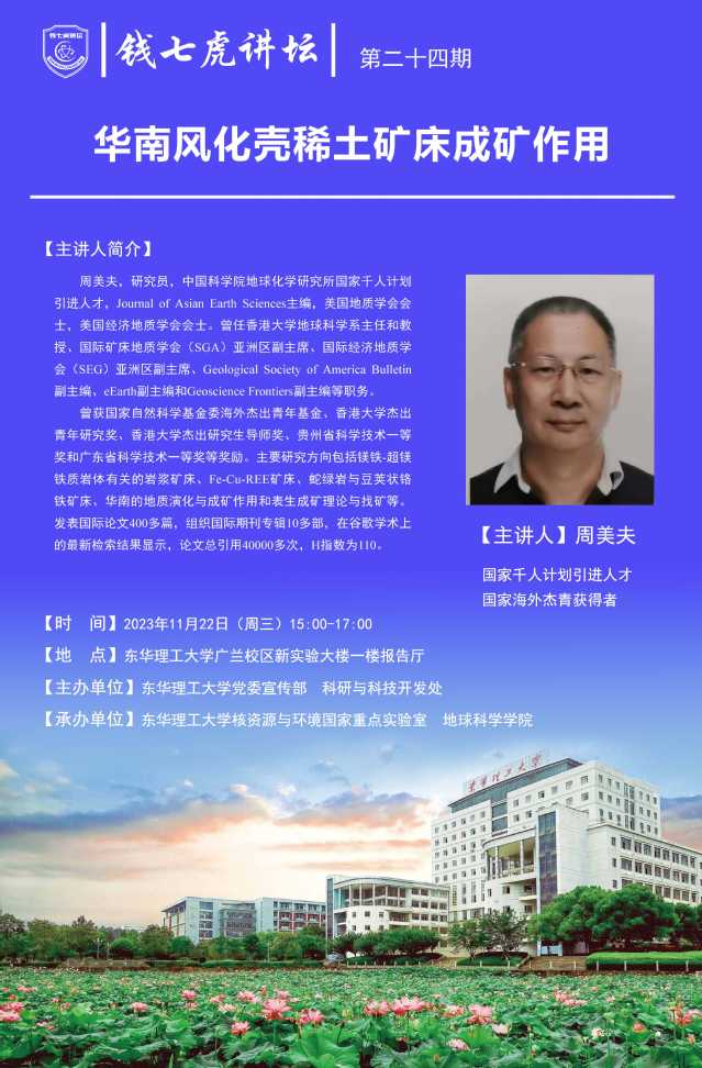 应核资源与环境国家重点实验室邀请,中国科学院地球化学研究所周美夫研究员来到“万搏官网入口_万搏中国”,以“华南风化壳稀土矿床成矿作用”为主题开展讲座。欢迎全校师生届时前往聆听。