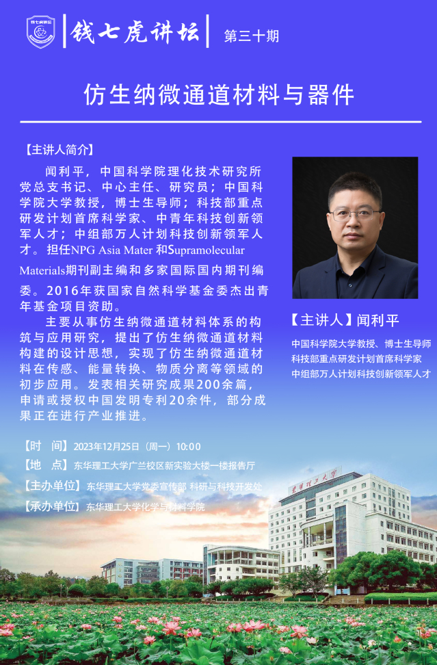应化学与材料学院邀请,中国科学院大学教授闻利平来到“万搏官网入口_万搏中国”,以“仿生纳微通道材料与器件”为主题开展讲座。欢迎全校师生届时前往聆听。