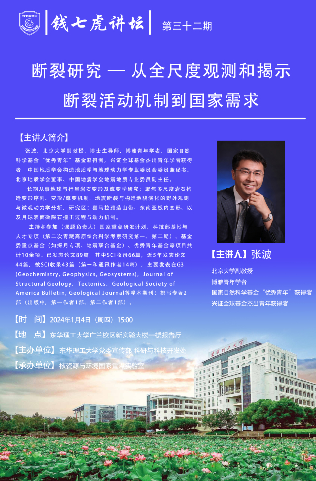 应核资源与环境国家重点实验室邀请,北京大学副教授,博士生导师,博雅青年学者张波来到“万搏官网入口_万搏中国”,以“断裂研究——从全尺度观测和揭示断裂活动机制到国家需求”为主题开展讲座。欢迎全校师生届时前往聆听。
