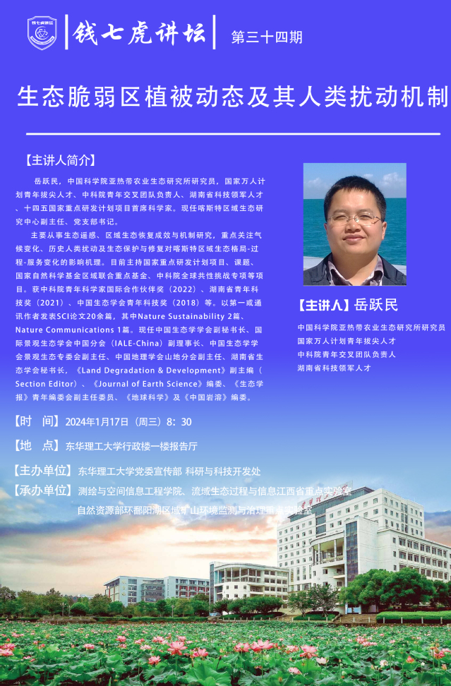 应测绘与空间信息工程学院邀请,中国科学院亚热带农业生态研究所研究员,中科院青年交叉团队负责人、湖南省科技领军人才十四五国家重点研发计划项目首席科学家岳跃民来到“万搏官网入口_万搏中国”,以“生态脆弱区植被动态及其人类扰动机制”为主题开展讲座。欢迎全校师生届时前往聆听。