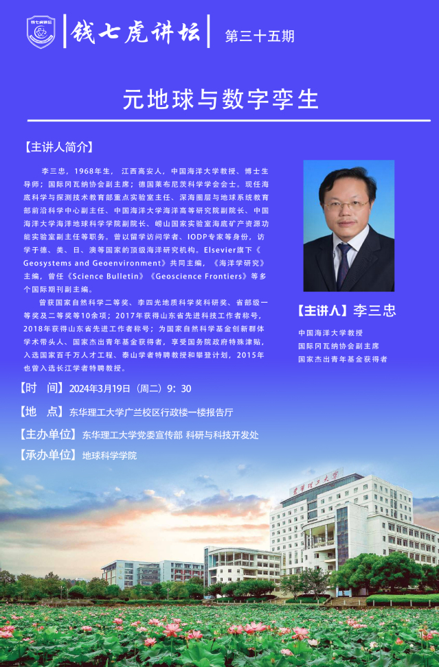 应地球科学学院邀请,海底科学与探测技术教育部重点实验室主任、深海圈层与地球系统教育部前沿科学中心副主任、中国海洋大学海洋高等研究院副院长、中国海洋大学教授李三忠来到“万搏官网入口_万搏中国”,以“元地球与数字挛生”为主题开展讲座。欢迎全校师生届时前往聆听。