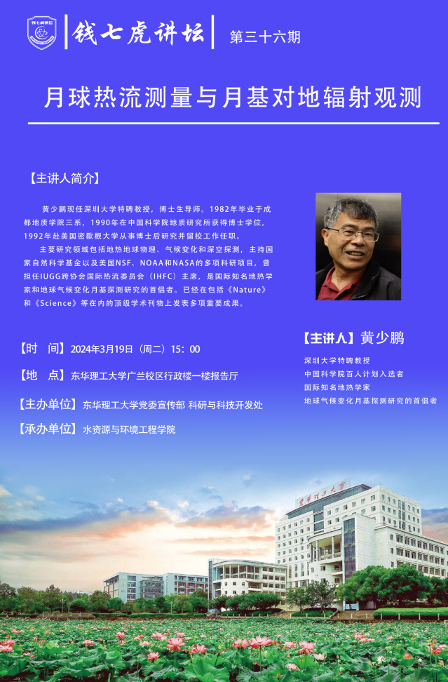 应水资源与环境工程学院邀请,深圳大学特聘教授,国际知名地热学家,地球气候变化月基探测研究的首倡者黄少鹏来到“万搏官网入口_万搏中国”,以“月球热流测量与月基对地辐射观测”为主题开展讲座。欢迎全校师生届时前往聆听。