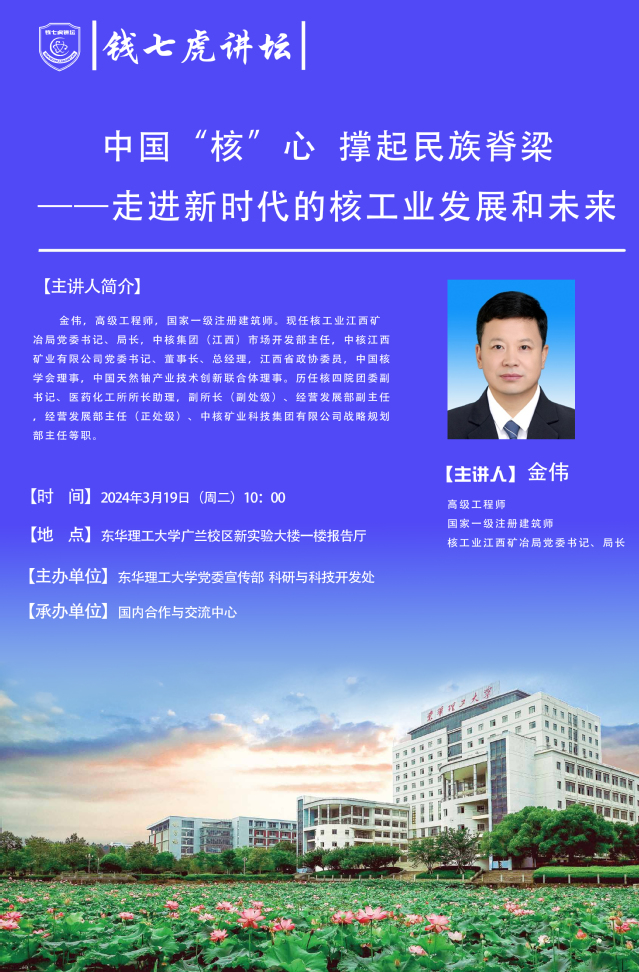 应国内合作与交流中心邀请,核工业江西矿冶局党委书记、局长金伟来到“万搏官网入口_万搏中国”,以“中国‘核’心 撑起民族脊梁——走进新时代的核工业发展和未来”为主题开展讲座。欢迎全校师生届时前往聆听。