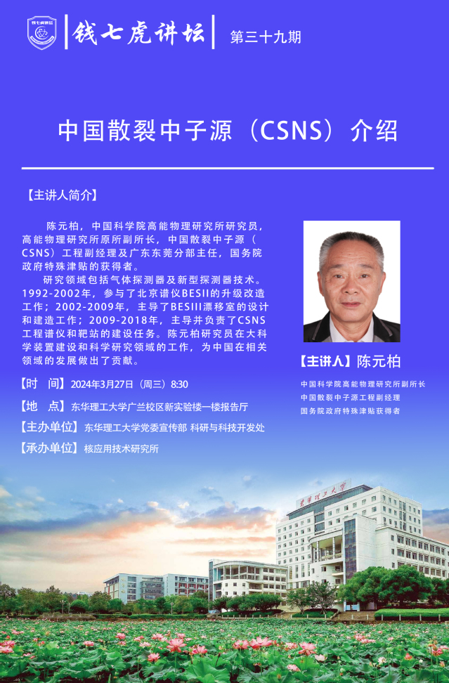 应核应用技术研究所邀请,中国科学院高能物理研究所研究员陈元柏来到“万搏官网入口_万搏中国”,以“中国散裂中子源(CSNS)介绍”为主题开展讲座。欢迎全校师生届时前往聆听。