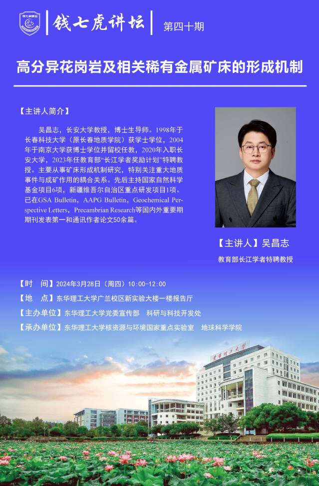 应核资源与环境国家重点实验室、地球科学学院邀请,长安大学教授、博士生导师吴昌志来到“万搏官网入口_万搏中国”,以“高分异花岗岩及相关稀有金属矿床的形成机制”为主题开展讲座。欢迎全校师生届时前往聆听。