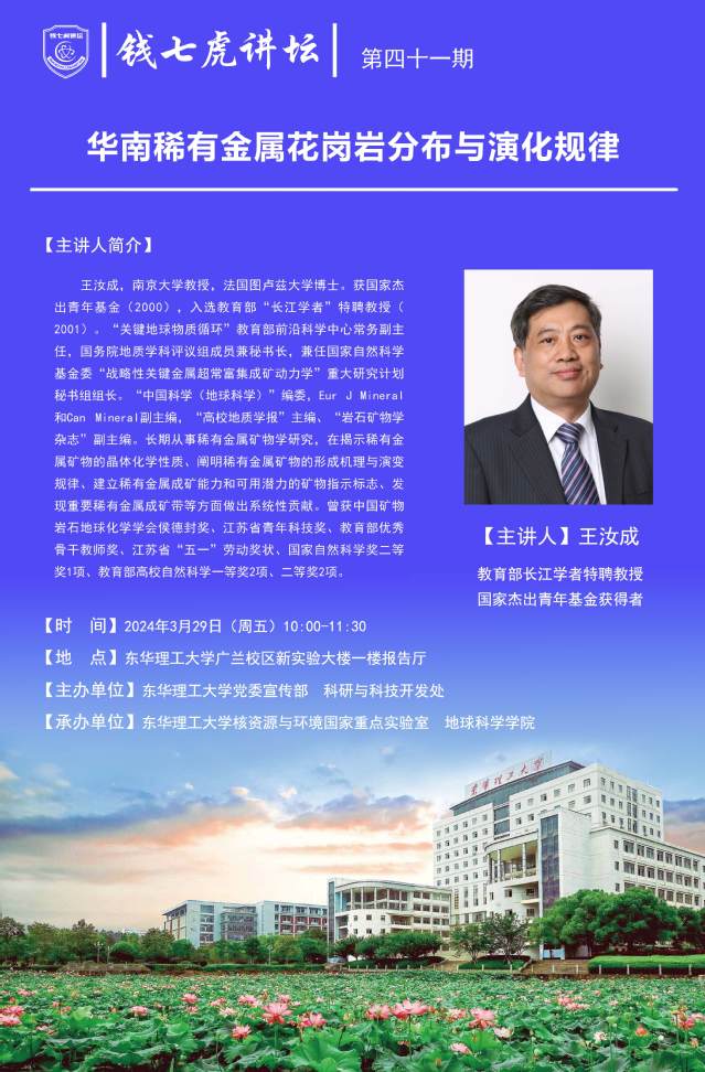 应核资源与环境国家重点实验室、地球科学学院邀请,南京大学矿物学教授,法国图卢兹大学博士王汝成来到“万搏官网入口_万搏中国”,以“华南稀有金属花岗岩分布与演化规律”为主题开展讲座。欢迎全校师生届时前往聆听。
