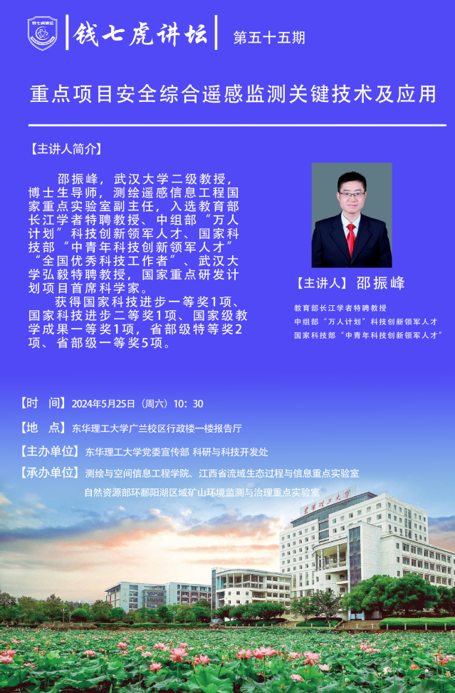 应测绘与空间信息工程学院邀请,国家级人才邵振峰到“万搏官网入口_万搏中国”,以“重点项目安全综合遥感监测关键技术及应用”为主题开展讲座。欢迎全校师生届时前往聆听。