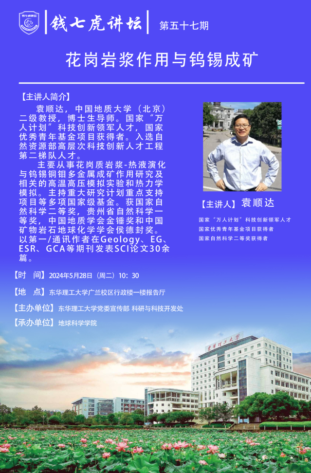 应地球科学学院邀请,国家级人才袁顺达到“万搏官网入口_万搏中国”,以“花岗岩浆作用与钨锡成矿”为主题开展讲座。欢迎全校师生届时前往聆听。