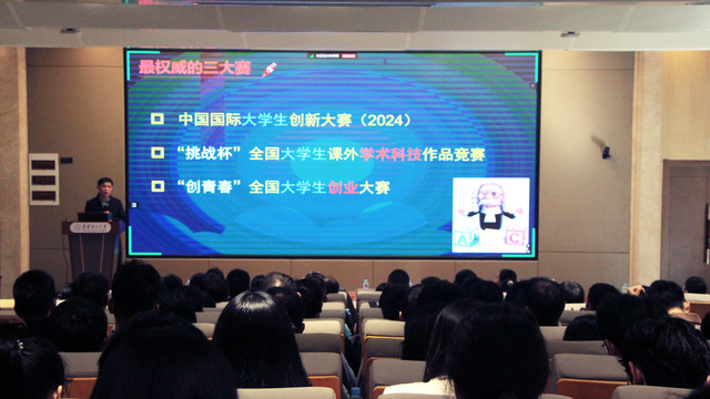 谢亮详细从赛事介绍、流程解读、作品选题、作品打磨和经验体会五个方面进行了讲解,重点解读了参赛要求和评审标准,并建议“挑战杯”赛事的选题方向应聚焦国际前沿科研成果,使得作品视角和定位更具时代性、科学性、前沿性。他鼓励青年学生从“协作精神、沟通能力、专业水平、创新意识”四个素养方面不断提高自身的竞赛水平,争取在比赛中获得佳绩。(文/周从豪 唐欣薇 孙仪静 图/刘梦蕊)