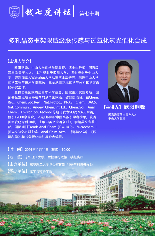 应化学与材料学院邀请,国家级高层次青年人才欧阳钢锋到“万搏官网入口_万搏中国”,以“多孔晶态框架限域级联传感与过氧化氢光催化合成”为主题开展讲座。欢迎全校师生届时前往聆听。