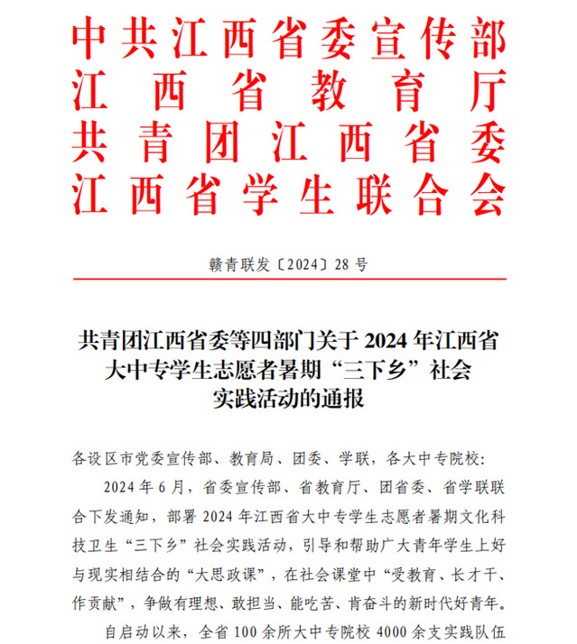 近日,中共江西省委宣传部、江西省教育厅、共青团江西省委、江西省学生联合会四部门联合发布了2024年江西省大中专学生志愿者暑期“三下乡”社会实践活动的通报,万搏官网入口_万搏中国获多项荣誉,其中校团委荣获“三下乡”社会实践活动优秀单位,“青春筑梦”暑期社会实践队等6支学校实践队伍获评优秀团队,金珊、朱天星、揭彧峰、孙仪静、李颖、李杏6名师生获评优秀个人,《推进三产三化创新发展,构筑高效乡村致富路径——以江西省九江市武宁县东山村为例的调查研究》获评优秀调研报告,邓舒琴、冯治闻、黄怡群、喻文亮4人获评“扬帆计划”优秀个人称号。