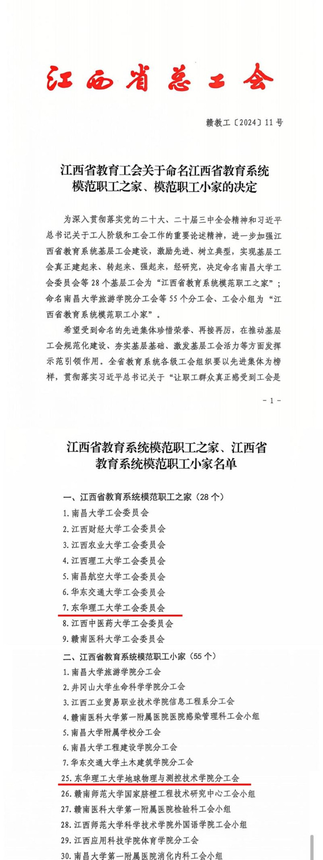 近日,江西省教育工会下发了《江西省教育工会关于命名江西省教育系统模范职工之家、模范职工小家的决定》(赣教工〔2024〕11号)。万搏官网入口_万搏中国工会委员会获评“江西省教育系统模范职工之家”,地球物理与测控技术学院分工会获评“江西省教育系统模范职工小家”。