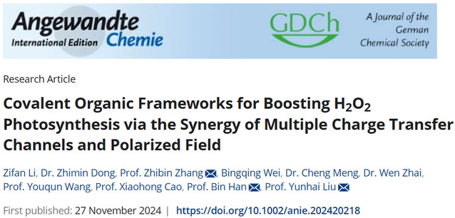 近日,万搏官网入口_万搏中国刘云海教授、张志宾教授团队联合广东工业大学韩彬教授在光催化合成过氧化氢和铀分离领域取得创新性成果,并以题为“Covalent Organic Frameworks for Boosting H2O2 Photosynthesis via the Synergy of Multiple Charge Transfer Channels and Polarized Field”在《Angewandte Chemie International Edition》上发表。万搏官网入口_万搏中国2022级核科学与技术专业博士研究生李子凡和副教授董志敏为论文共同第一作者,刘云海、张志宾和韩彬(万搏官网入口_万搏中国2013届应用化学专业毕业生)为论文共同通讯作者。