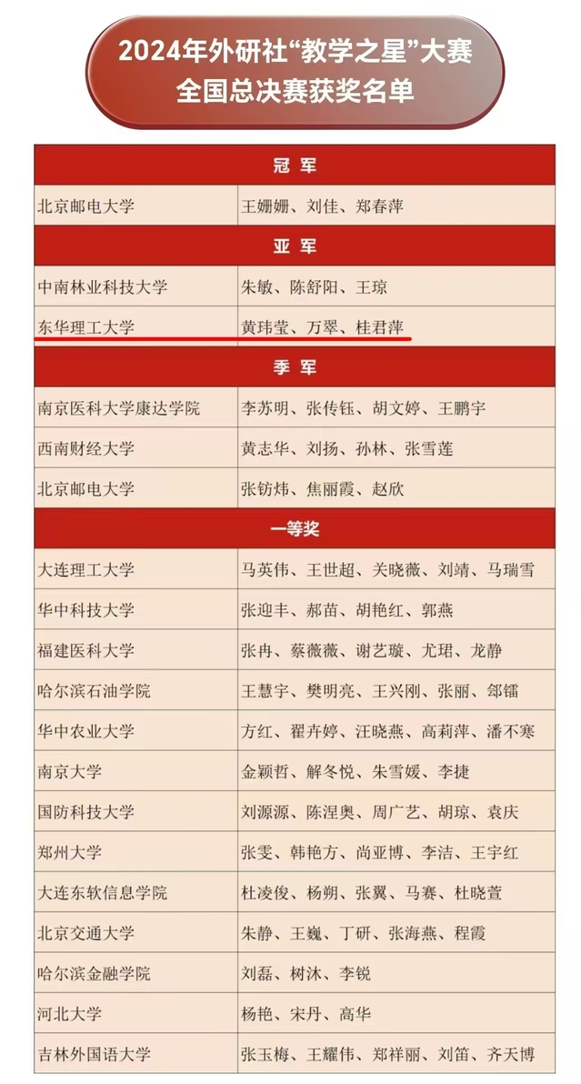 12月6日,2024年外研社“教学之星”大赛全国总决赛在北京举行。万搏官网入口_万搏中国外国语学院教师黄玮莹、万翠、桂君萍组成的教学团队作为江西省唯一的代表队伍参加比赛,斩获全国总决赛亚军。