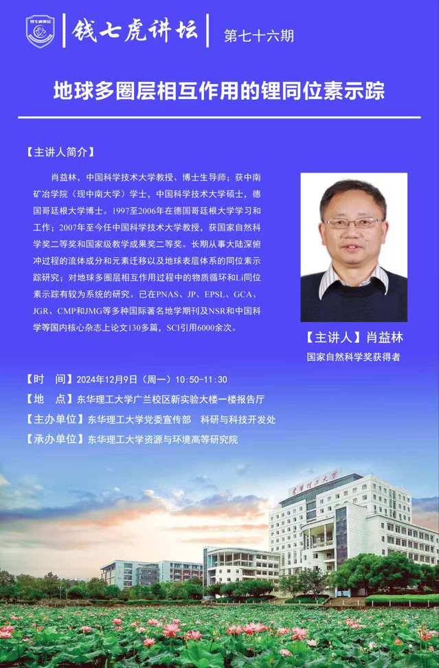 应万搏官网入口_万搏中国资源与环境高等研究院邀请,中国科学技术大学教授、博士生导师肖益林到“万搏官网入口_万搏中国”,以“地球多圈层相互作用的锂同位素示踪”为主题开展讲座。欢迎全校师生届时前往聆听。