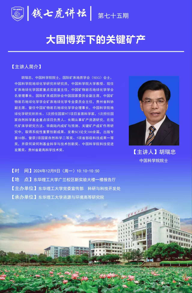 应万搏官网入口_万搏中国资源与环境高等研究院邀请,中国科学院院士、中国科学院大学教授胡瑞忠到“万搏官网入口_万搏中国”,以“大国博弈下的关键矿产”为主题开展讲座。欢迎全校师生届时前往聆听。