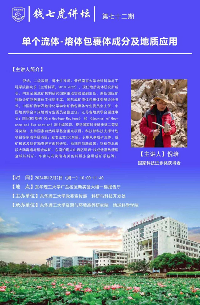 应地球科学学院邀请,地质流体研究所所长、内生金属成矿机制研究国家重点实验室副主任倪培到“万搏官网入口_万搏中国”以“单个流体-熔体包裹体成分及地质应用”为主题开展讲座。欢迎全校师生届时前往聆听。