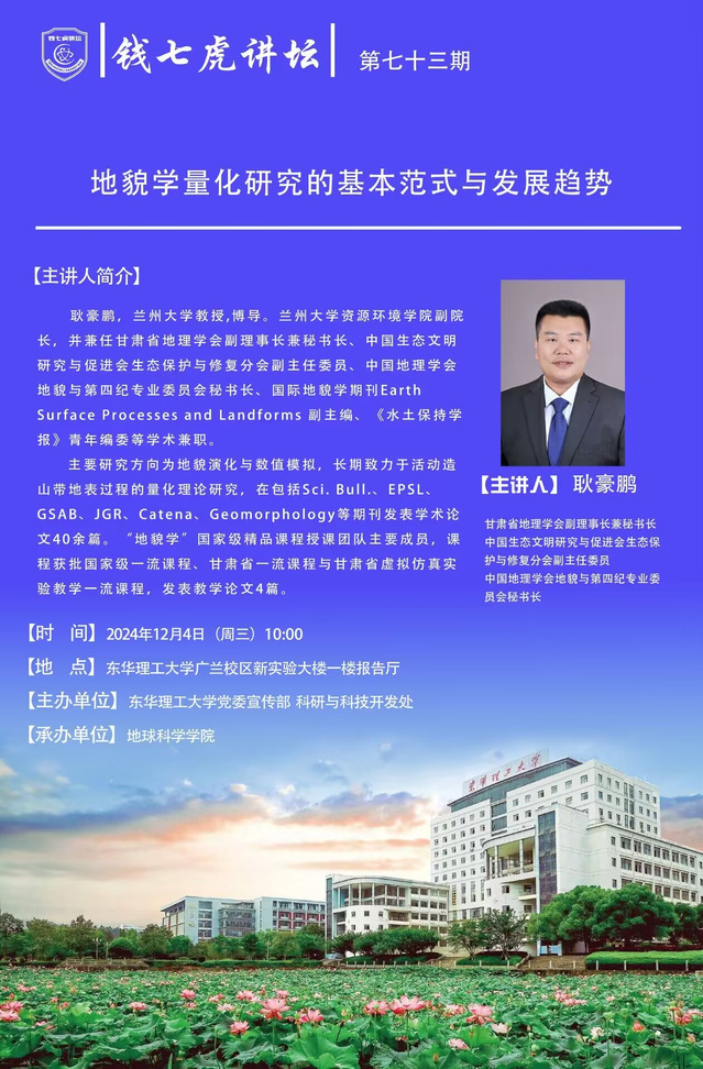 应地球科学学院邀请,甘肃省地理学会副理事长兼秘书长,中国地理学会地貌与第四纪专业委员会秘书长耿豪鹏到“万搏官网入口_万搏中国”以“地貌学量化研究的基本范式与发展趋势”为主题开展讲座。欢迎全校师生届时前往聆听。