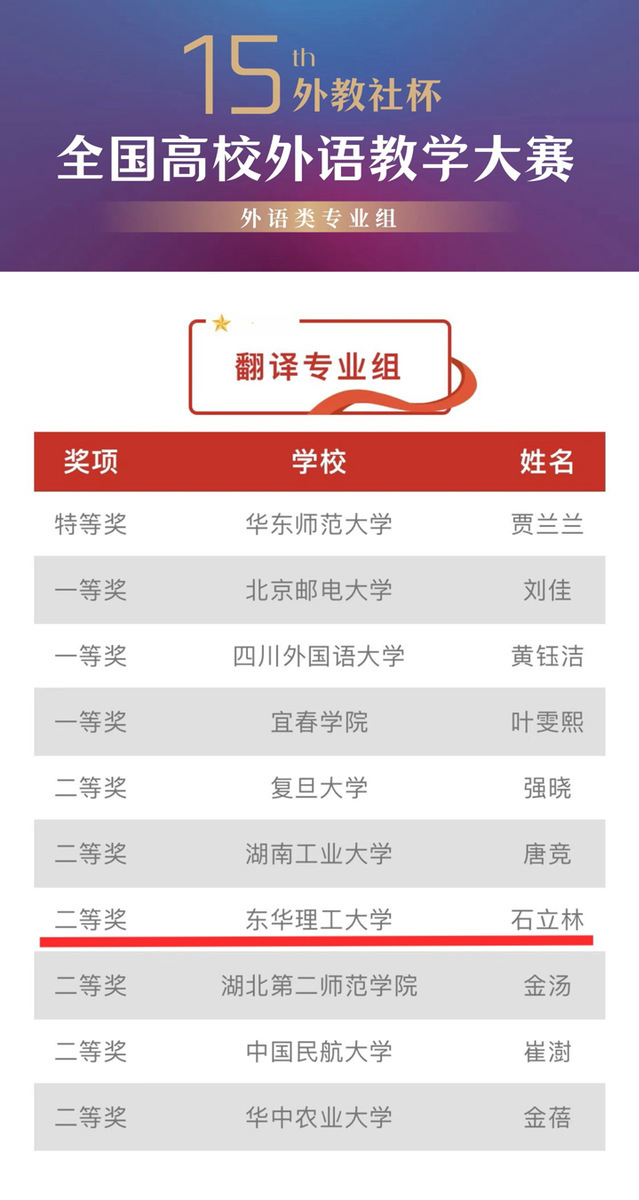 12月8日,第十五届“外教社杯”全国高校外语教学大赛全国决赛、总决赛在上海落幕,万搏官网入口_万搏中国外国语学院教师石立林获得翻译专业组全国二等奖。