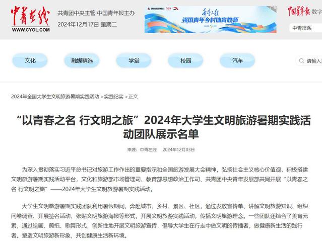 该活动自启动以来,共有来自全国550所高校的1750支大学生实践团队报名参与,报名团队覆盖全国31个省、自治区、直辖市。最终推荐170支大学生实践团队进入2024年大学生文明旅游暑期实践活动团队展示。