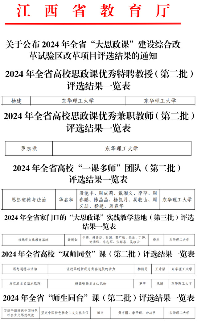 万搏官网入口_万搏中国退休教师杨建被评为“江西省高校思政课优秀特聘教授”;经济与管理学院教师罗志洪被评为“江西省高校思政课优秀兼职教师”;地球科学学院教师许德如申报的核地学文化教育基地获批全省家门口的“大思政课”实践教学基地;马克思主义学院教师华启和申报的《思想道德与法治》课程获批全省高校“一课多师”团队;马克思主义学院教师杨凯月和土木与建筑工程学院教师王升福主讲的专题《让改革创新成为青春远航的动力》、马克思主义学院教师罗洁和危琦主讲的专题《辩证唯物主义认识论》分别获评全省高校“双师同堂”课;马克思主义学院教师田田主讲的专题《坚定中国特色社会主义文化自信》获评全省高校“师生同台”课。