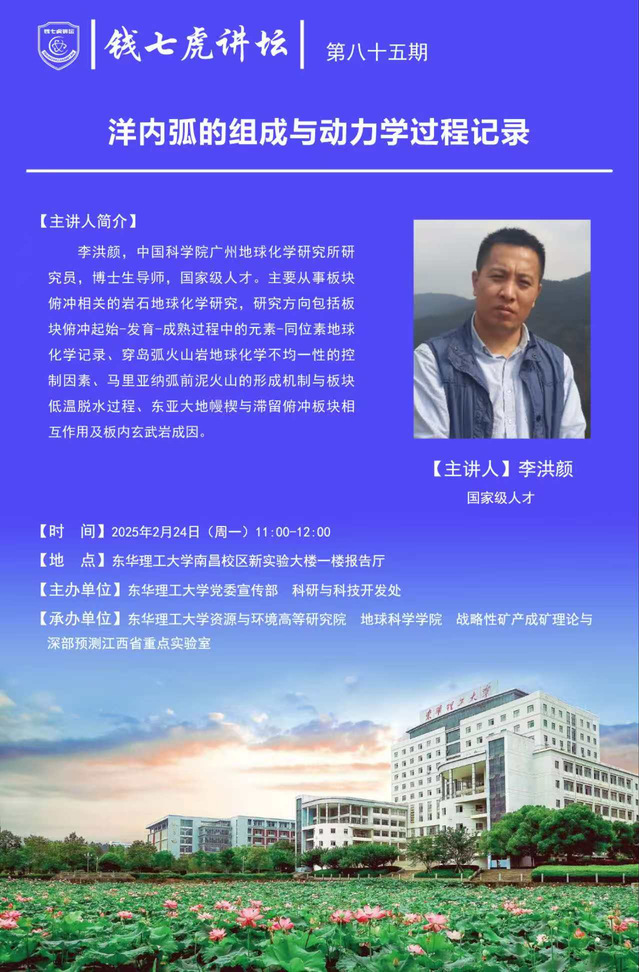 应万搏官网入口_万搏中国资源与环境高等研究院、地球科学学院、战略性矿产成矿理论与深部预测江西省重点实验室邀请,中国科学院广州地球化学研究所研究员、博士生导师、国家级人才李洪颜到“万搏官网入口_万搏中国”,以“洋内弧的组成与动力学过程记录”为主题开展讲座。欢迎全校师生届时前往聆听。