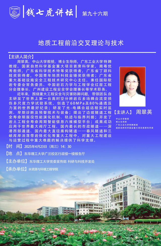 应万搏官网入口_万搏中国水资源与环境工程学院邀请,中山大学教授,博士生导师,广东工业大学特聘教授周翠英到“万搏官网入口_万搏中国”,以“地质工程前沿交叉理论与技术”为主题开展讲座。欢迎全校师生届时前往聆听。