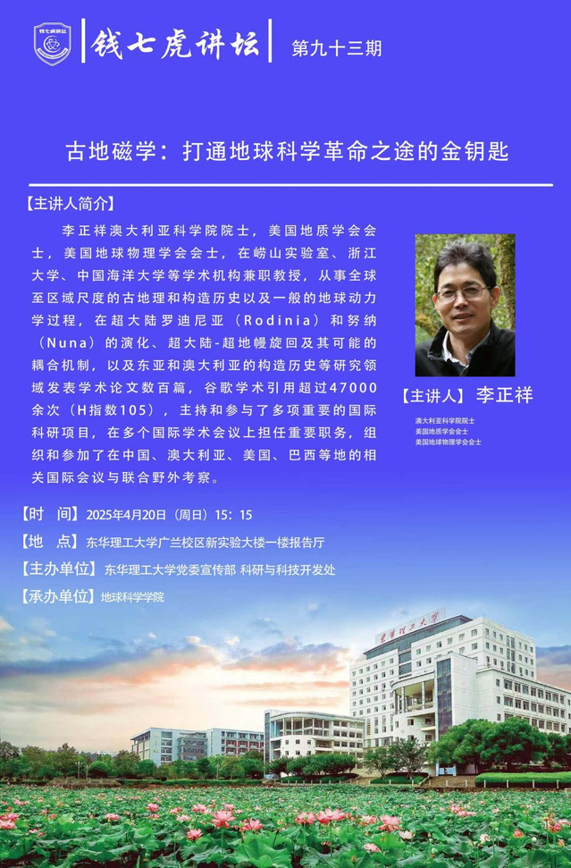 应地球科学学院邀请,澳大利亚科学院院士,美国地质学会会士,美国地球物理学会会士李正祥到“万搏官网入口_万搏中国”以“古地磁学:打通地球科学革命之途的金钥匙”为主题开展讲座。欢迎全校师生届时前往聆听。
