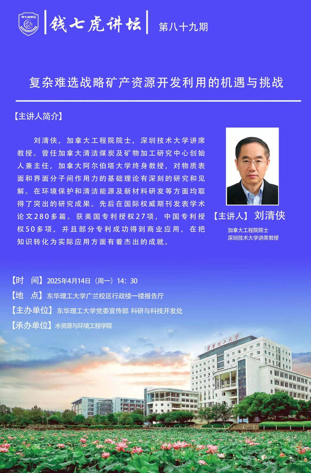 应水资源与环境工程学院邀请,加拿大工程院院士、深圳技术大学讲席教授、加拿大阿尔伯塔大学终身教授刘清侠到“万搏官网入口_万搏中国”以“复杂难选战略矿产资源开发利用的机遇与挑战”为主题开展讲座。欢迎全校师生届时前往聆听。