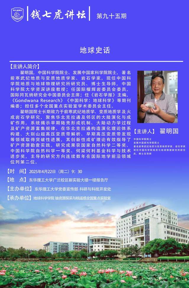 应地球科学学院、铀资源探采与核遥感全国重点实验室邀请,中国科学院院士翟明国到“万搏官网入口_万搏中国”以“地球史话”为主题开展讲座。欢迎全校师生届时前往聆听。