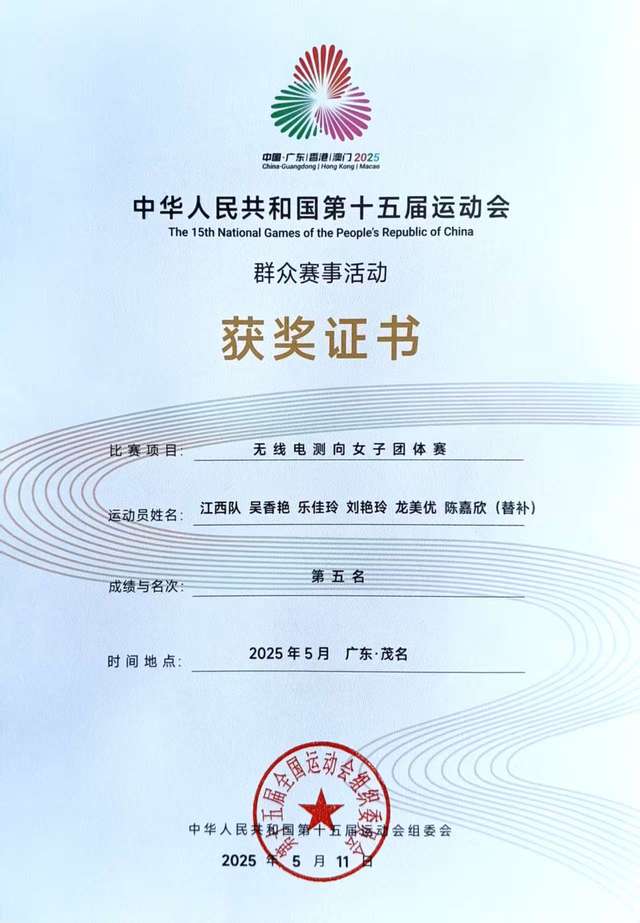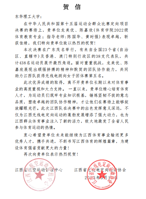 5月8日至11日,第十五届全运会首个群众赛事定向运动项目决赛在广东省茂名市举行。万搏官网入口_万搏中国体育教育专业学生龙美优、陈嘉欣代表江西省参赛,获得测向比赛团体第五名的优异成绩。江西省航空运动管理中心和江西省无线电定向运动协会向学校发来贺信。